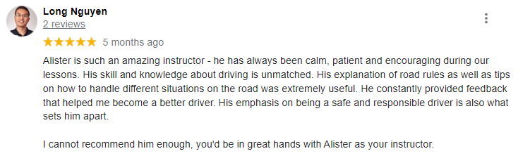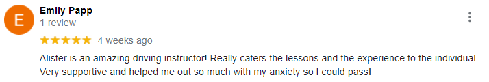 We have been lucky enough to have some amazing clients. Below are some of our testimonials. We are so flattered and honoured when we receive such great comments and it’s a testament to our Driving Instructor Alister’s teaching methods and the core of our driving – Integrity.